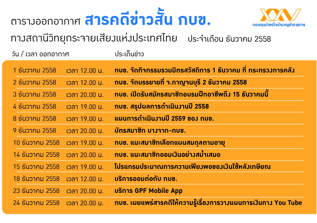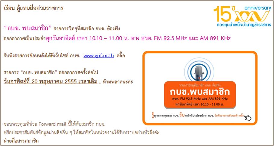 ประชาสัมพันธ์สารคดีข่าวสั้น กบข. ออกอากาศช่วงข่าวเป็นประจำทางวิทยุ FM 92.5