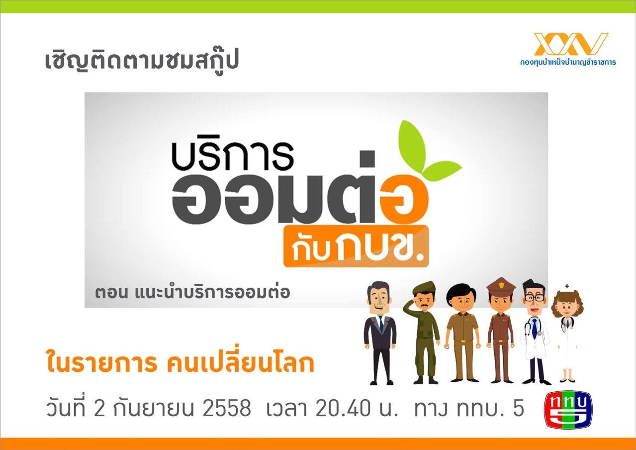 บริการออมต่อ กับ กบข. ในรายการคนเปลี่ยนโลก วันที่ 2 ก.ย. 58 เวลา 20.40 น. (ททบ. 5)